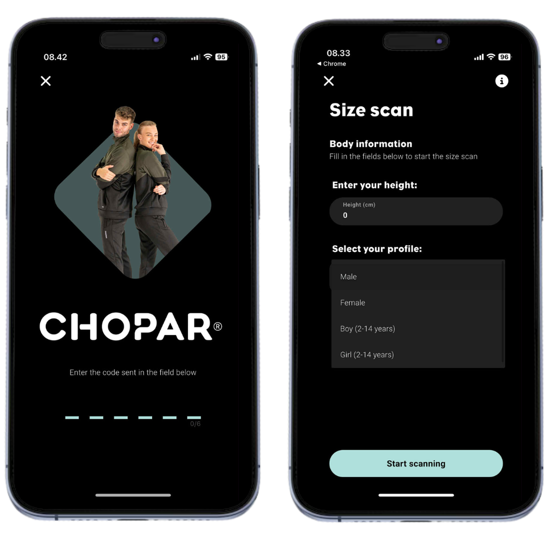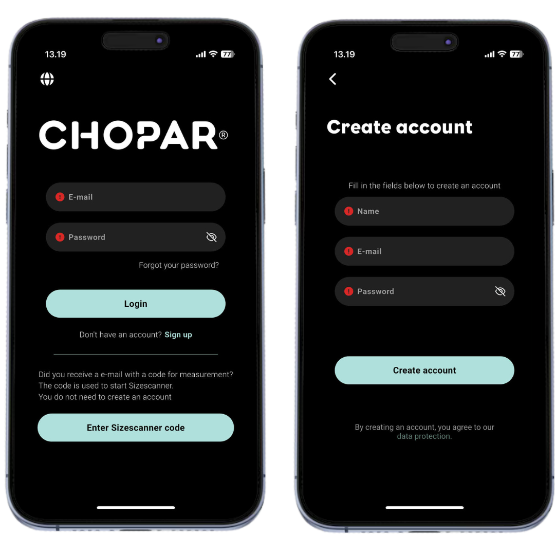 - Atleten ska börja med att ladda ner CHOPAR SizeScanner-appen via App Store eller Google Play.