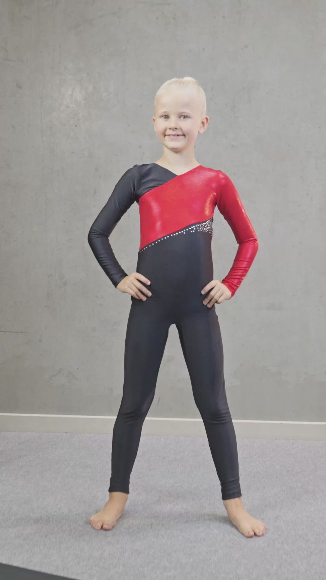 Träning möter tävling. Många barn önskar sig “en riktig gymnastikdräkt” till den veckovisa träningen. Här är den. En gymnastikdräkt med både glitter och paljetter som får gymnasten att stråla i hallen. Hel dräkt med långa ärmar – perfekt för de ibland kalla gymnastiksalarna.