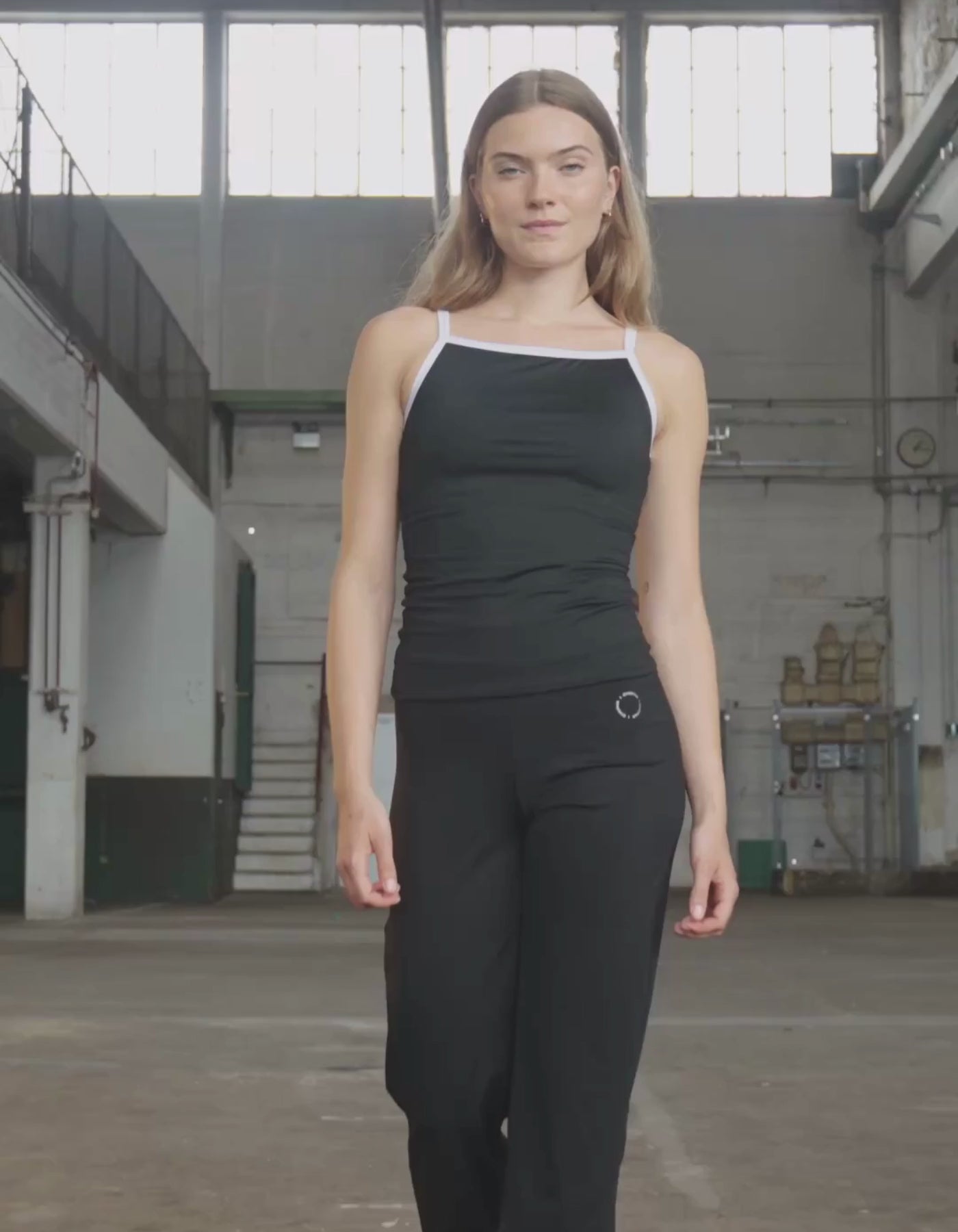 Det mjuka materialet gör att toppen kan användas i alla situationer och ger härlig komfort. De vita banden skapar en elegant kontrast till den svarta toppen och tillför en fin detalj.